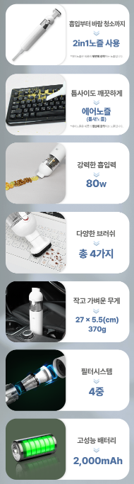- 차량 외에도 책상 위, 키보드, 소파 틈새 등 가정용 보조 청소기가 필요하신 분